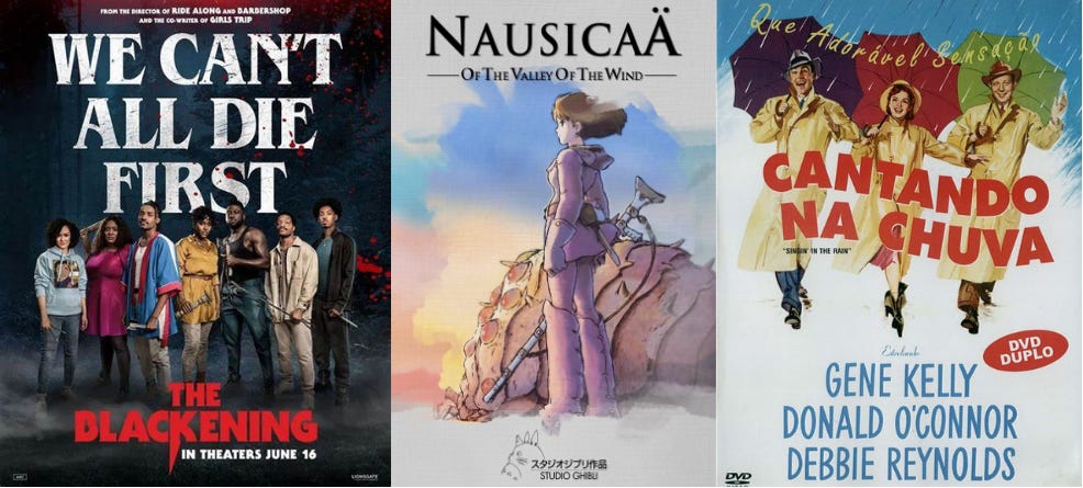 Vi também: The Blackening (rimos demais), Nausicaä do Vale do Vento (decidi que, depois de ter maratonado Yorgos Lanthimos, vou ver tudo do Hayao Miyazaki; gostei desse, mas admito que vi em suaves prestações antes de dormir) e Cantando na chuva (eu não queria rever, mas o boy me convenceu mostrando que o filme era curtinho e… um clássico é um clássico, bom demais!).